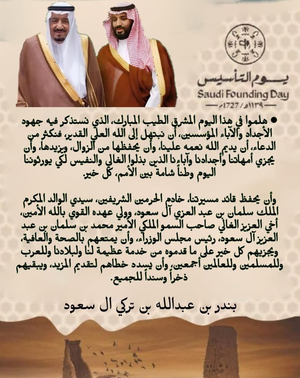 وأن يحفظ قائد مسيرتنا، خادم الحرمين الشريفين، سيدي الوالد المكرم الملك سلمان بن عبد العزي آل سعود، وولي عهده القوي بالله الأمين، أخي العزيز الغالي صاحب السمو الملكي الأمير محمد بن سلمان بن عبدالعزيز آل سعود، رئيس مجلس الوزراء، وأن يمتعهم بالصحة والعافية ويجزيهم كل خير على ما قدموه من خدمة عظيمة لنا ولبلادنا وللعرب وللمسلمين وللعالمين أجمعين، وأن يسدد خطاهم لتقديم المزيد، ويبقيهمذخراً وسنداً للجميع.بندر بن عبدالله بن تركي آل سعود