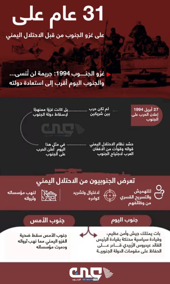 تزامنًا مع حلول الذكرى الـ(31) لغزو الاحتلال اليمني للجنوب..جنوبيون يتذكرون مجازر الاحتلال اليمني ويطلقون وسم #ذكرىغزو اليمن_للجنوب