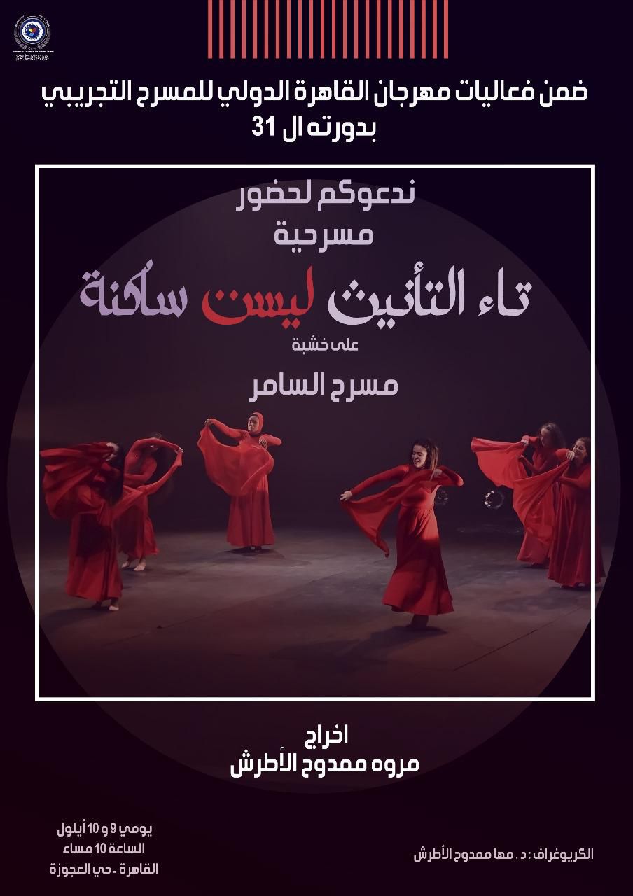 وفي التفاصيل اختارت إدارة مهرجان القاهرة التجريبي للمسرح الدولي برئاسة الدكتور سامح مهران مسرحية “تاء التانيث ليست ساكنة” فكرة وإخراج الفنانة السورية مروه ممدوح الاطرش، كريوغراف مها الاطرش، لتمثل دولة العراق ضمن العروض الرسمية التي أقرت واختيرت من الدول العربية والأجنبية ..