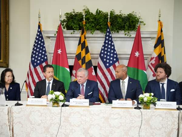 اجتمع الملك عبدالله الثاني بمجموعة من الرؤساء التنفيذيين وممثلي شركات وجامعات أمريكية لبحث فرص الاستثمار بالمملكة وتعزيز التعاون الاقتصادي، وأكد جلالته خلال الاجتماع، الذي نظمه حاكم ولاية ميريلاند ويس مور، أهمية البناء على الشراكة الاستراتيجية بين الأردن والولايات المتحدة، لتوسيع التعاون، بما يعود بالفائدة على البلدين