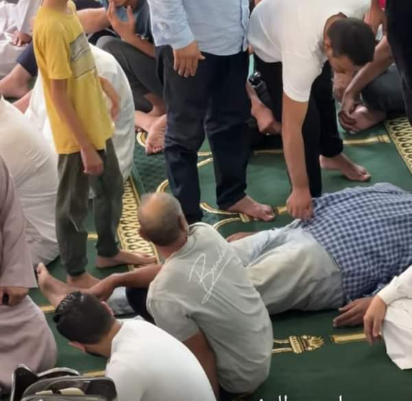 وبينما كان المؤذن يرفع الأذان، داعياً المسلمين إلى الصلاة، ولحظة قول اشهد ان لا اله الا الله لفظ الرجل أنفاسه الأخيرة، ساجداً لله، مات وهو يؤدي فريضة من فرائض الإسلام، في مشهد مهيب يبعث الطمأنينة والسكينة في النفوس.
