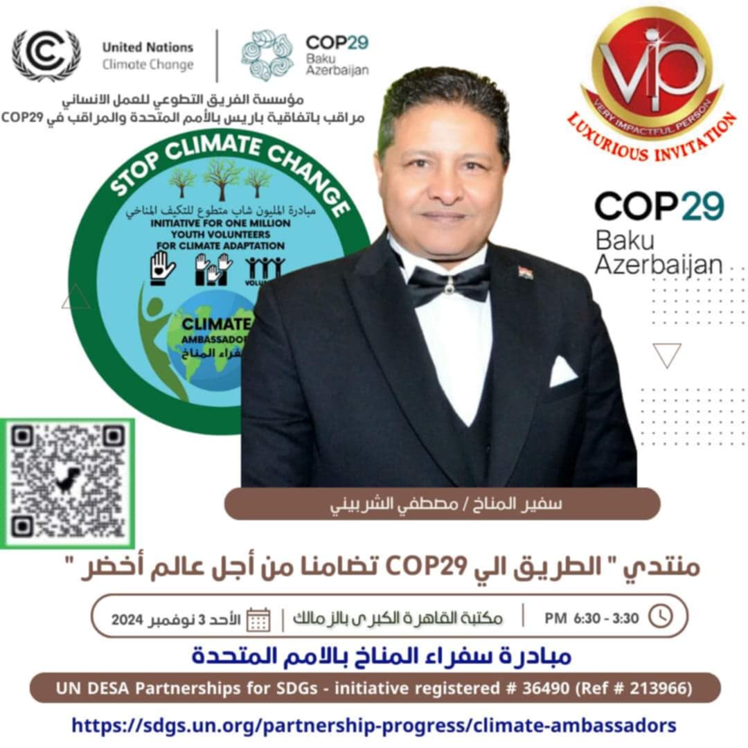 يعقد سفير المناخ السيد / مصطفى الشربيني منتدى الطريق الى COP29 بمكتبة القاهرة الكبرى بالزمالك 17 شارع محمد مظهر الزمالك الساعة 3 يوم الأحد الموافق 3 نوفمبر 2024 حيث سيتم مناقشة قضايا المناخ في COP29 ورسائل ومهام وفد المراقبين خلال حضورهم COP29 في أذربيجان ، حيث تأكد الحجز للطيران والاقامة بحضور ومشاركة وفد مكون من 25 سفيرا للمناخ كمراقبين في المنطقة الزرقاء COP29 من مبادرة سفراء المناخ اعضاء الاتحاد النوعي للمناخ ومؤسسة الفريق التطوعي للعمل الانساني المرقب باتفاقية باريس، وسوف يغادر الوفد من المراقبين يوم 8 نوفمبر 2024 وحتى 22 نوفمبر 2024 وايضا سوف نتلقى يوم الأحد القادم طلبات الحضور من خلال مليء أستمارة وارفاق صورة جواز السفر لمؤتمر بون للمناخ في يونيو القادم ومؤتمر المحيطات بفرنسا في مايو القادم ومؤتمر COP30 في نوفمبر 2025 وذلك مجانا من اجل تضامنا نحو الاقتصاد الاخضر ودعم الدولة المصرية ولن تقبل اي طلبات لغير السادة الفاعلين معنا بالحضور والتفاعل مع منشورات المؤسسة ، حيث نوفر الفيزا Schengen للاتحاد الاوروبي European Union visa مجانا ودخول المنطقة الزرقاء كمراقبين لمؤتمرات الأمم المتحدة ، حيث لا يسمح بدخول غير المراقبين يومي الافتتاح بحضور أكثر من 120 من رؤساء وملوك الدول .
