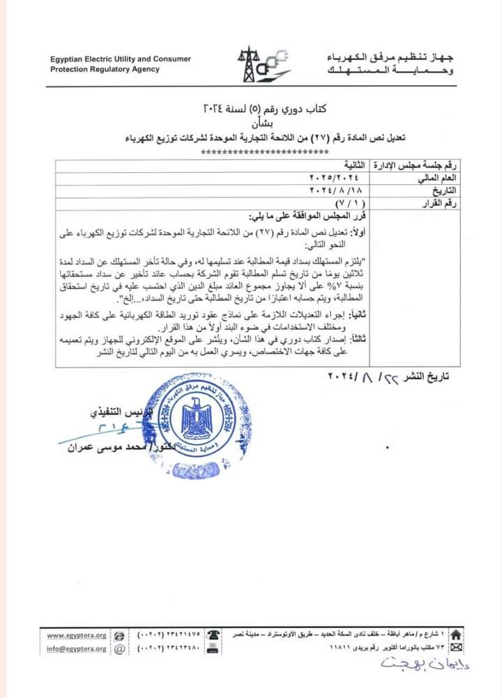 و دعماً لهم ، وتيسيراً عليهم ، وتحسيناً لبيئة العمل ، مما يسهم في تعزيز الاستثمارات ، ودعم النمو الاقتصادي ، أصدر وزير الكهرباء والطاقة المتجددة ، الدكتور محمود عصمت ، القرار رقم(5) لسنه 2024 بتعديل بعض القوانين المتعلقة بغرامات التأخير ، وذلك استجابةً للمذكرات المقدمة ، بتاريخ 22 أغسطس الماضي ، من الدكتور صبحي نصر ، عضو مجلس إدارة الاتحاد المصري لجمعيات المستثمرين ، رئيس المركز الوطني للتعليم المزدوج التكنولوجي ، نائب رئيس جمعية مستثمري العاشر من رمضان ، رئيس جمعية مستثمري السويس ، خلال شهري مارس وأبريل الماضيين .