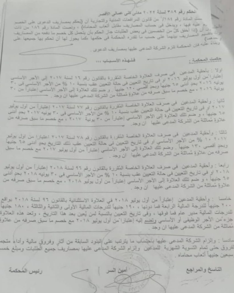 بعد صدور القانون رقم ١٦ لسنة ۲۰۱۷ ، ۷۷ لسنة ۲۰۱۷، ۷۸ لسنة ٩٦،٢٠١٧لسنة ۲۰۱۸ بتقرير علاوة خاصة للعاملين بالدولة من غير المخاطبين بقانون الخدمة المدنية وضمها للأجر الأساسى وبالرعم من أن نص المادة ٣٨ من لائحة نظام العاملين بالشركة أكد على أحقية العاملين فى العلاوات المقررة بالقوانين سالفة الذكر وقد نصت على أن يحدد أجر العامل عند بداية التعيين ببداية الربط الوارد بجدول الأجور المرفقة مع سريان تطبيق أحكام القوانين الصادرة بشأن العلاوات الخاصة أو المنح التي تقررها الدولة للعاملين وبمناسبة رفض الشركة في تنفيذ نصوص القانون ورفضها تنفيذ نص المادة ٣٨ من لائحة نظام العاملين بها فقد إضطر العاملون لرفع دعاوى قضائية ضد الشركة للحصول على أحكام تمكنهم من تنفيذ صرف تلك العلاوات وقد صدرت تلك الأحكام تباعاً وعلى فترات متعاقبة إلا أن الشركة ضربت بتلك الأحكام عرض الحائط ، علماً بأن الشركة استنفذت كل الطرق القانونية وكل مراحل التقاضي إلا أن تلك الأحكام أصبحت أحكاما نهائية حيث تكبدت الشركة ملايين الجنيهات لسداد فرق الرسم النسبي المستحقة للمحكمة علاوة على مصاريف الأستئناف ومصاريف الرسوم القضائية بالنقض مع علم الشركة بأن السند القانونى فى إستحقاق تلك العلاوات ظاهر لا يجانبه شك وأن محاكم الإستئناف قد أيدت تلك الأحكام