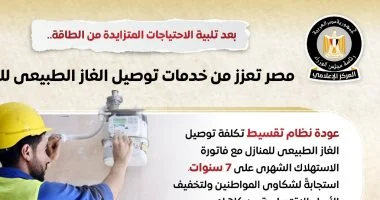 وفي هذا الصدد أصدر المركز الإعلامي لمجلس الوزراء تقريرًا تضمن إنفوجرافات تسلط الضوء على تعزيز مصر خدمات توصيل الغاز الطبيعي للمواطنين، بعد تلبية الاحتياجات المتزايدة من الطاقة.